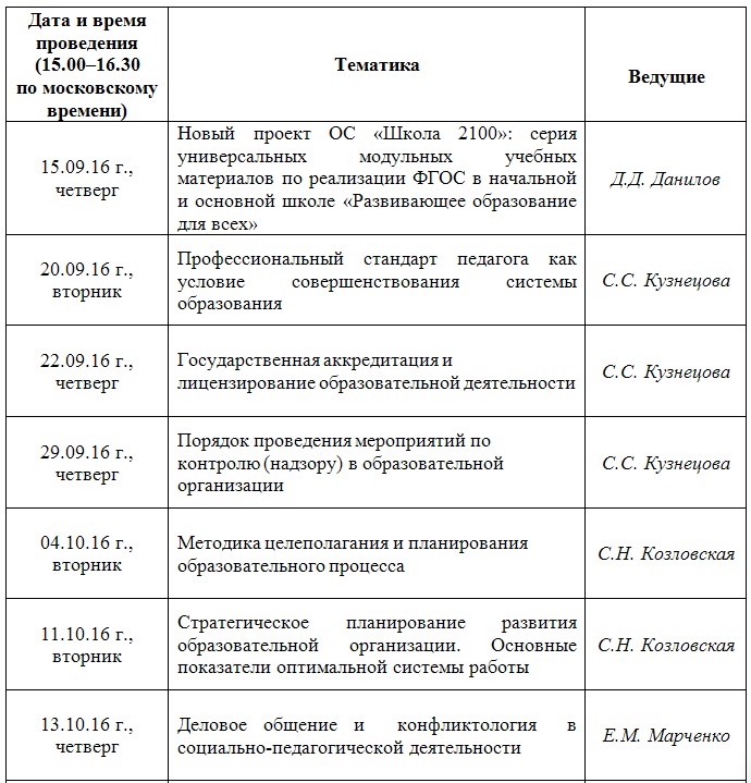 Программа вебинара и ссылка для регистрации будут размещаться на сайте за 3-4 дня до мероприятия. Консультации и справки можно получить по телефону: 8 (495) 778-16-74, а также по электронной почте: umc@school2100.com.